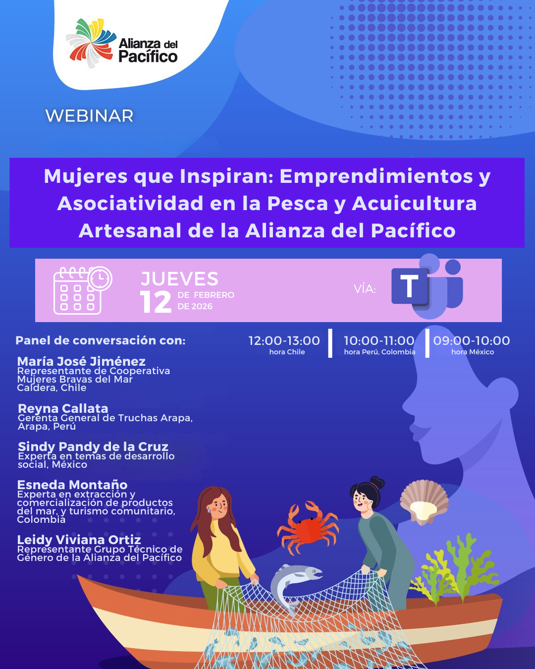 Este evento reunirá a mujeres que Inspiran: Emprendimientos y Asociatividad en la Pesca y Acuicultura artesanal de la Alianza del Pacífico.