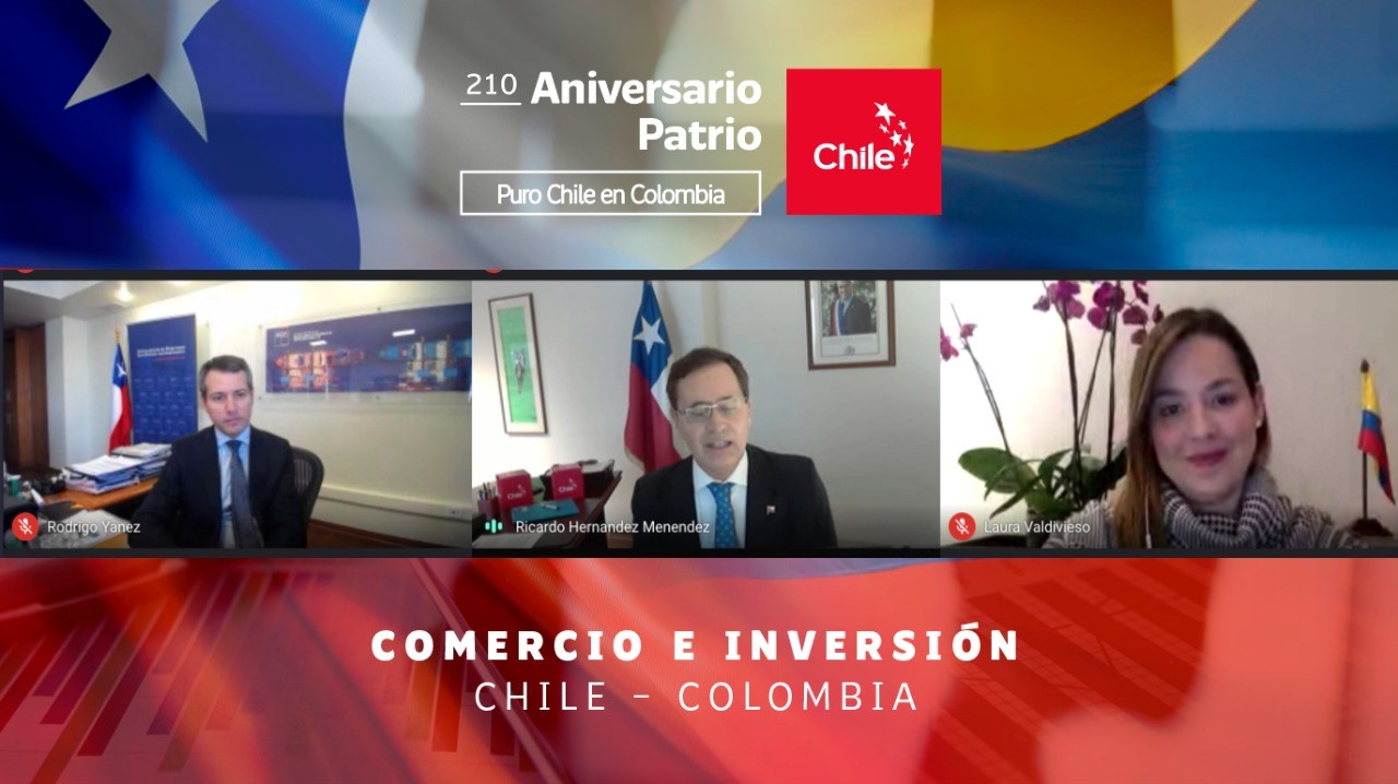 14 de septiembre, 2020.- Hoy se realizó el seminario virtual "Comercio e Inversión en Chile y Colombia post COVID-19", instancia en la que participó el Subsecretario de Relaciones Económicas Internacionales (SUBREI), Rodrigo Yáñez, junto a la Viceministra de Comercio Exterior en el Ministerio de Comercio, Industria y Turismo de Colombia, y el Embajador de Chile en Colombia, Ricardo Hernández. La actividad que contó con más de 60 asistentes se realizó en el marco del 210º aniversario patrio de Colombia.