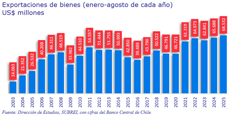 Martes, 09 de septiembre de 2025. En los primeros ocho meses de 2025, las exportaciones del país escalaron hasta los US$ 68.532 millones, anotando un alza del 4,3% frente a igual período de 2024 (+US$ 2.845 millones), marcando al mismo tiempo valores récords tanto para las exportaciones tradicionales como las no tradicionales, según informaron este martes la Subsecretaría de Relaciones Económicas Internacionales (SUBREI) y la Dirección General de Exportaciones (ProChile), con cifras del Banco Central y del Servicio Nacional de Aduanas.
