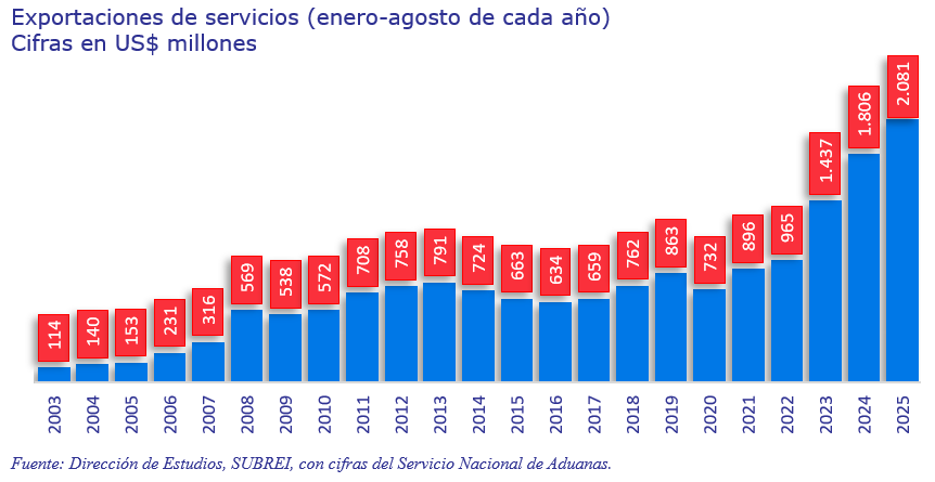 Para los primeros ocho meses del año, las exportaciones de servicios continuaron exhibiendo un sólido y sostenido dinamismo, anotando prestaciones al exterior por US$ 2.081 millones. Este monto significó un alza de un 15,2%, en relación con el mismo período de 2024.
