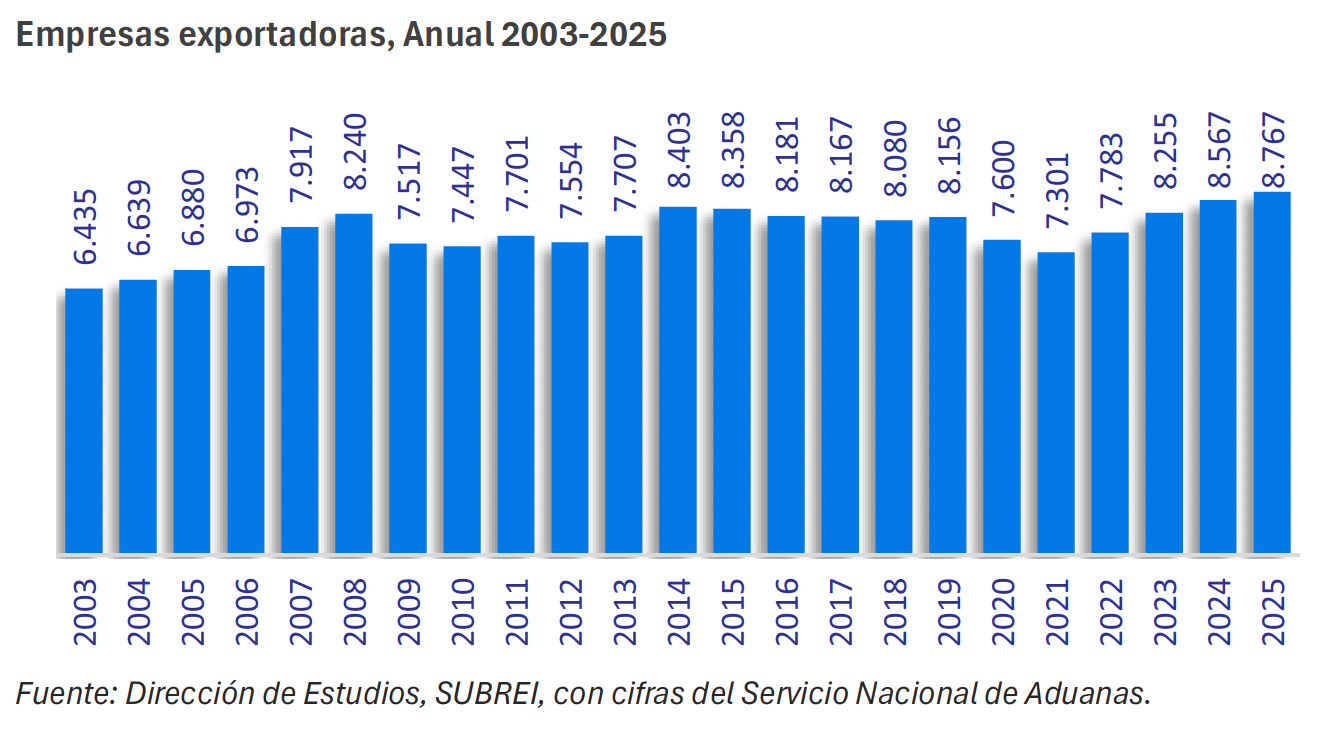 A lo largo del año 2025, un total de 8.767 empresas nacionales registraron exportaciones, creciendo un 2,3% con respecto a 2024, marcando de paso el mayor número de empresas con ventas al exterior desde que existen registros.